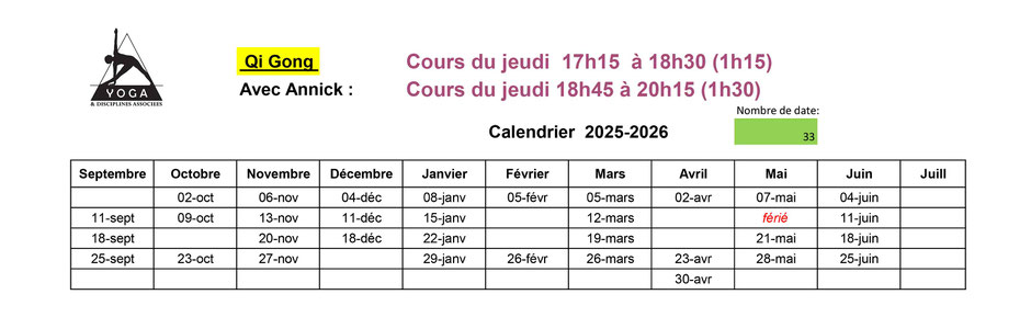 Les séances sont animées par Mme Annick Joassy, enseignante de Qi Gong, élève diplômée de l'Ecole Tao, depuis 5 ans.